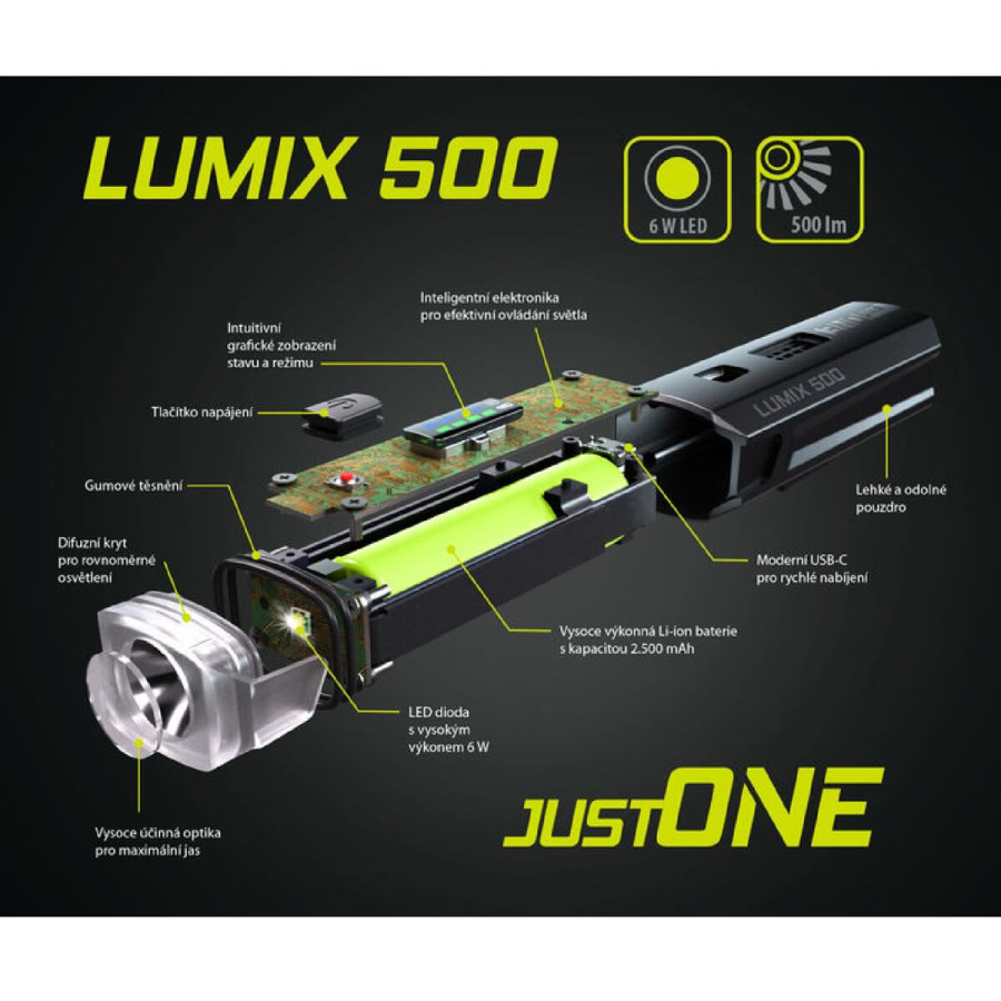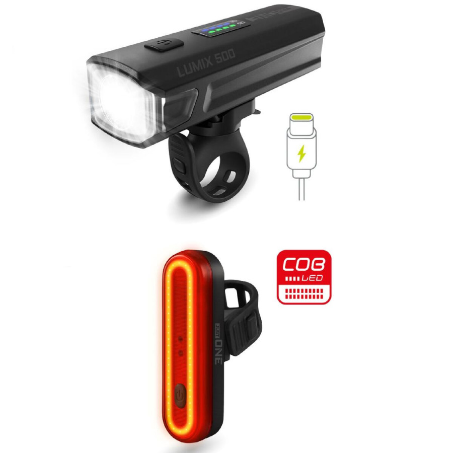 Sada osvetlenia na bicykel ONE Lumix 500 obsahuje dobíjacie predné aj zadné svetlo. Obe svetlá majú vodeodolnú konštrukciu a ich montáž aj demontáž je jednoduchá a rýchla. Predné svetlo má vysoko výkonnú bielu LED diódu 6 W a 4 funkcie – 3 intenzity svietenia, blikania. Zadné svetlo vysoko výkonnej červenej COB LED diódy so 6 funkciami – 2 intenzity svietenia, 4 typy blikania. Obe svetlá je možné nabíjať pomocou kábla USB-C, ktorý je súčasťou balenia. Predné svetlo LUMIX 500