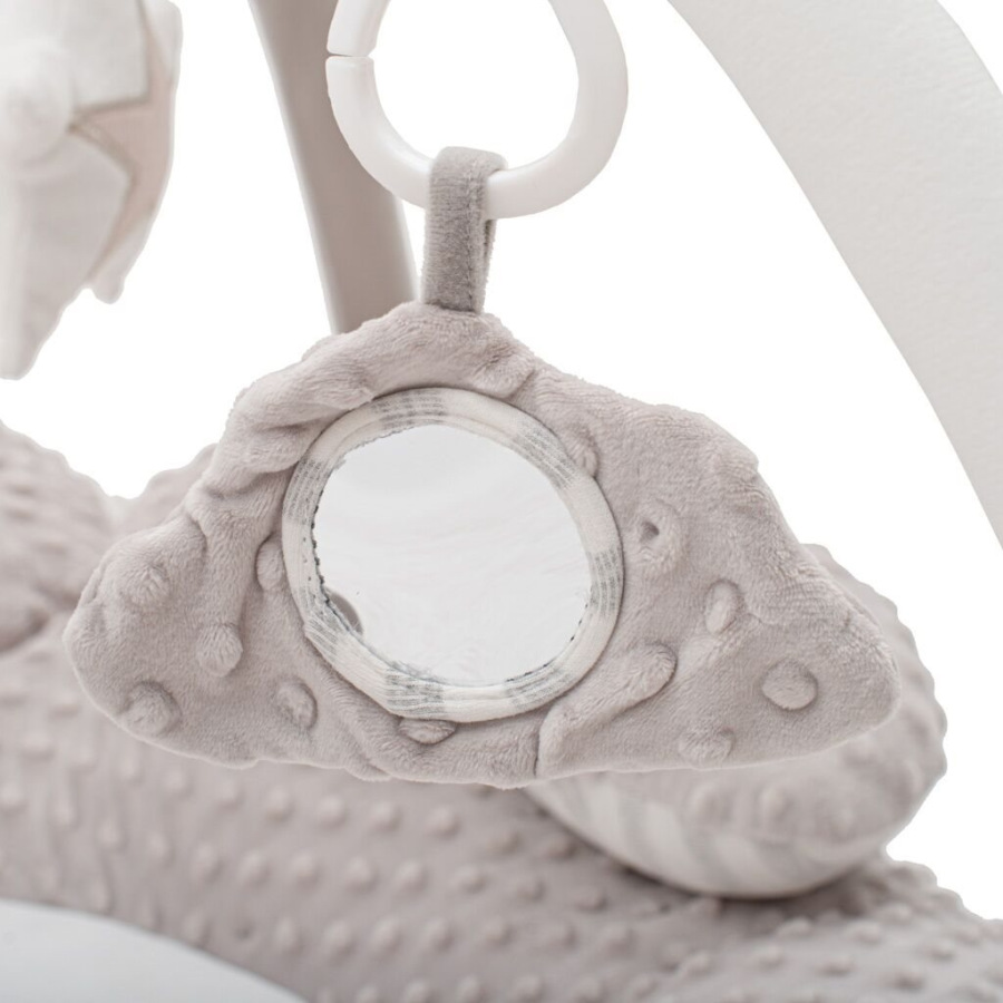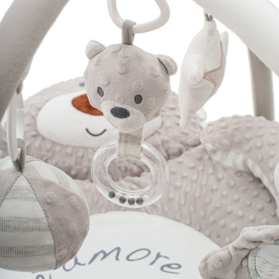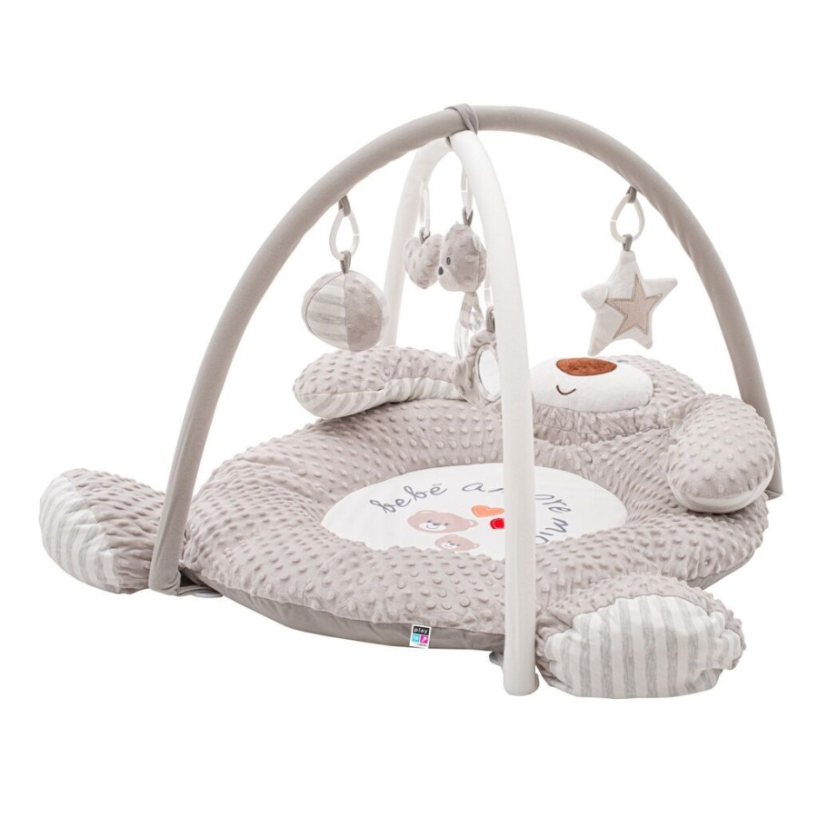 Vzdelávacia hracia deka z Minky s melódiou PlayTo s hrazdou rozvíja detskú predstavivosť vďaka spoznávaniu farieb a tvarov. Rozvíja zmysly hmatu, zraku aj sluchu vďaka šuštiacim a pohyblivým častiam. Horná strana je vyrobená z mäkkej, na dotyk veľmi príjemnej a hebkej Minky látky s výstupkami pre stimuláciu senzomotoriky, druhá strana je zo 100% bavlny. Príjemný a mäkký materiál umožňuje pohodlné ležanie na brušku alebo chrbte, umožňuje slobodu pohybu dieťatka a motivuje k zdvíhaniu hlavičky. Hračky je možné z hrazdičky ľahko zložiť a používať samostatne . Patrí tu zrkadlo, rôzne šuštiace časti, plyšová hračka s pískatkom, hryzátkom alebo zvončekom. V labke medvedíka sa nachádza hrací modul, ktorý po stlačení hrá melódiu. Možno ju použiť doma aj vonku. Vďaka jednoduchej konštrukcii a dodávanej taške možno deku ľahko prenášať. Pokiaľ deku práve nepoužívate, ľahko ju zložíte a uchováte tak pred prachom alebo prípadným poškodením. Vhodné pre deti od 3 mesiacov.