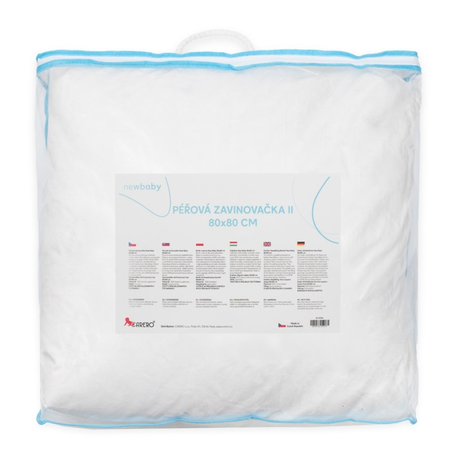 Luxusná páperová zavinovačka 80x80 cm New Baby. Táto luxusná páperová zavinovačka je synonymom pohodlia pri spánku. Zavinovačka poskytuje bábätku mäkký, teplý a bezpečný pocit podobný prostrediu v maminom brušku, čo pomáha dieťaťu prispôsobiť sa novým podmienkam. Vďaka vynikajúcim vlastnostiam peria zaisťuje zavinovačka stabilnú teplotu. Perie absorbuje vlhkosť a odvádza ju od tela počas spánku. Použité je špeciálne čistené a testované perie. Naše zavinovačky obsahujú 80 % draného husacieho peria a 20 % páperia (0,3 kg). Dodávame v praktickej taške na zips, ktorú môžete využiť aj na uskladnenie rôznych vecí doma.