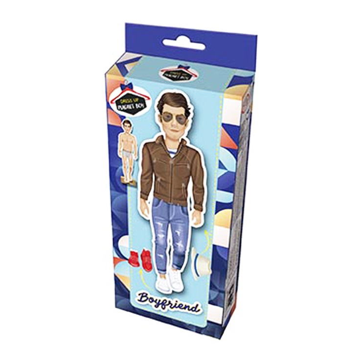 Balenie obsahuje obliekaciu postavu muža, 30 magnetických častí (oblečenie, topánky, doplnky) a drevený podstavec, vďaka ktorému možno vytvoriť nespočetne veľa módnych kreácií.