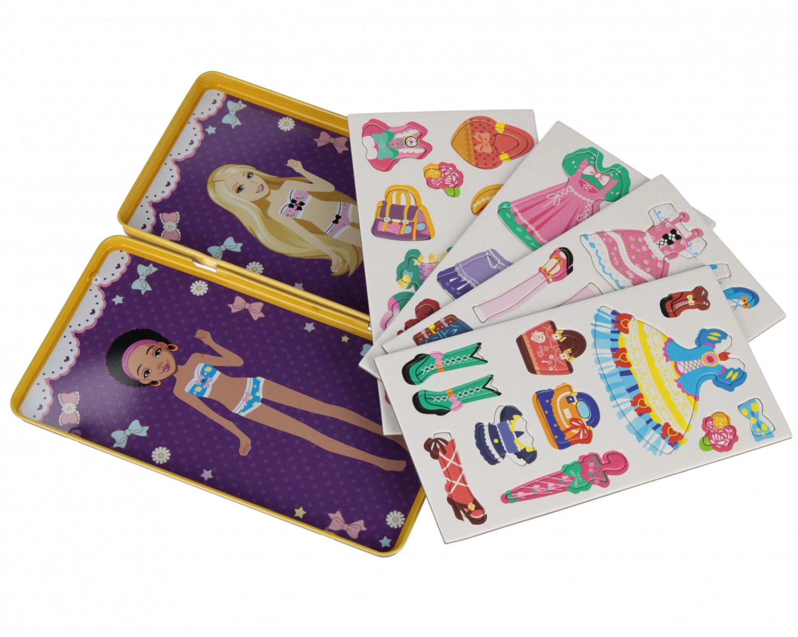 Magnetická hra Obliekanie pre dievčatá, kreatívna zábava, ktorá rozvíja predstavivosť. Pomocou magnetických prvkov môžeš vytvárať nespočetné množstvo štýlov a hrať sa na módnu návrhárku kdekoľvek. Má rozmery 20×1×18 cm. Obsah sady je 1× hracia doska s dvoma postavami, 4× šablóna s prvkami oblečenia. Cena je za kus. Vhodné pre deti vo veku 8+ rokov.