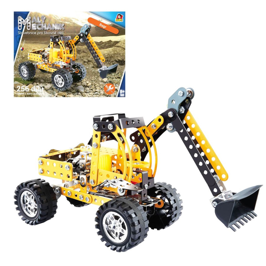 Malý mechanik - báger. Detská stavebnica Malý mechanik obsahuje kovové diely a plastové doplnky, spája sa pomocou skrutky a matičiek. 256 dielikov. Český box v grafickom dizajne radu Malý mechanik.
