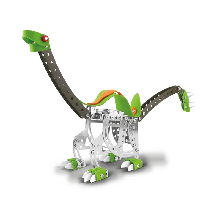 Malý mechanik - apatosaurus. Detská stavebnica Malý mechanik obsahuje kovové diely a plastové doplnky, spája pomocou šróbikov a matiček. 141 dielkov. Český box v grafickom dizajne rady Malý mechanik.