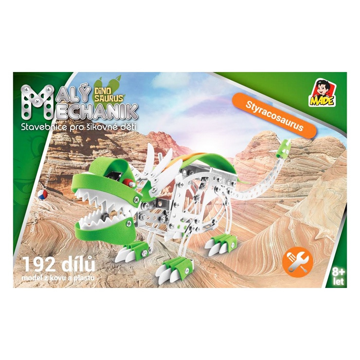 Malý mechanik ? dinosaurus. Detská stavebnica Malý mechanik obsahuje kovové diely a plastové doplnky, spája sa pomocou skrutiek a matičiek. 192 dielikov.
