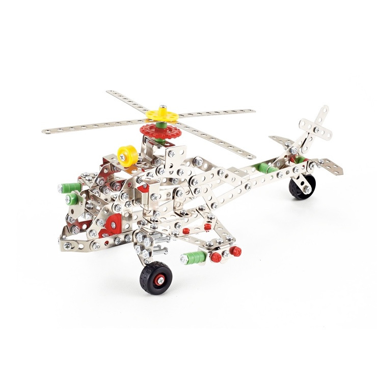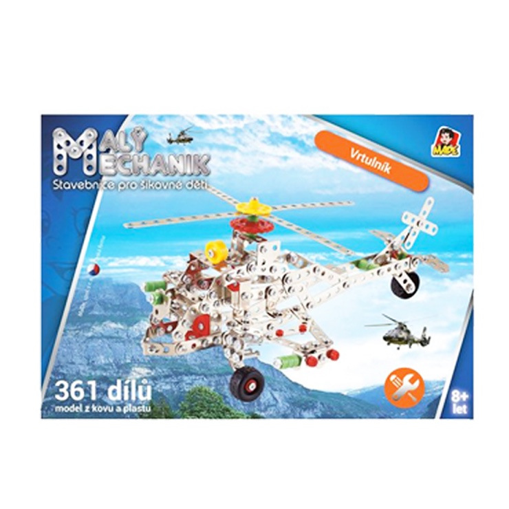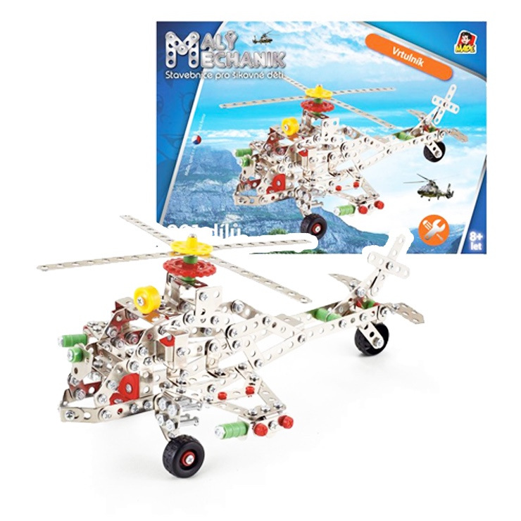 Malý mechanik - vrtuľník. Detská stavebnica Malý mechanik obsahuje kovové diely a plastové doplnky, spája sa pomocou skrutiek a matičiek. 361 dielikov. Stavebnice sú ideálnou voľbou pre všetky deti, rozvíja logické myslenie, jemnú motoriku, sústredenosť a učia trpezlivosti a pritom sú skvelou zábavou.