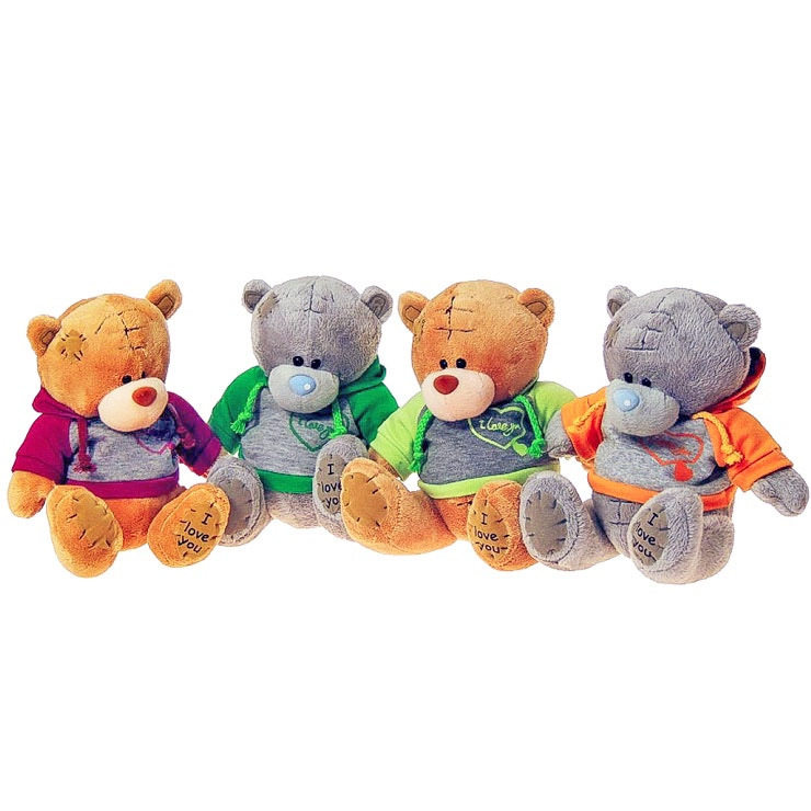 Plyšový 20cm sediaci medvedík so záplatami a farebnou mikinou. Možnosť výberu z rôznych farieb. Príjemný na dotyk.
