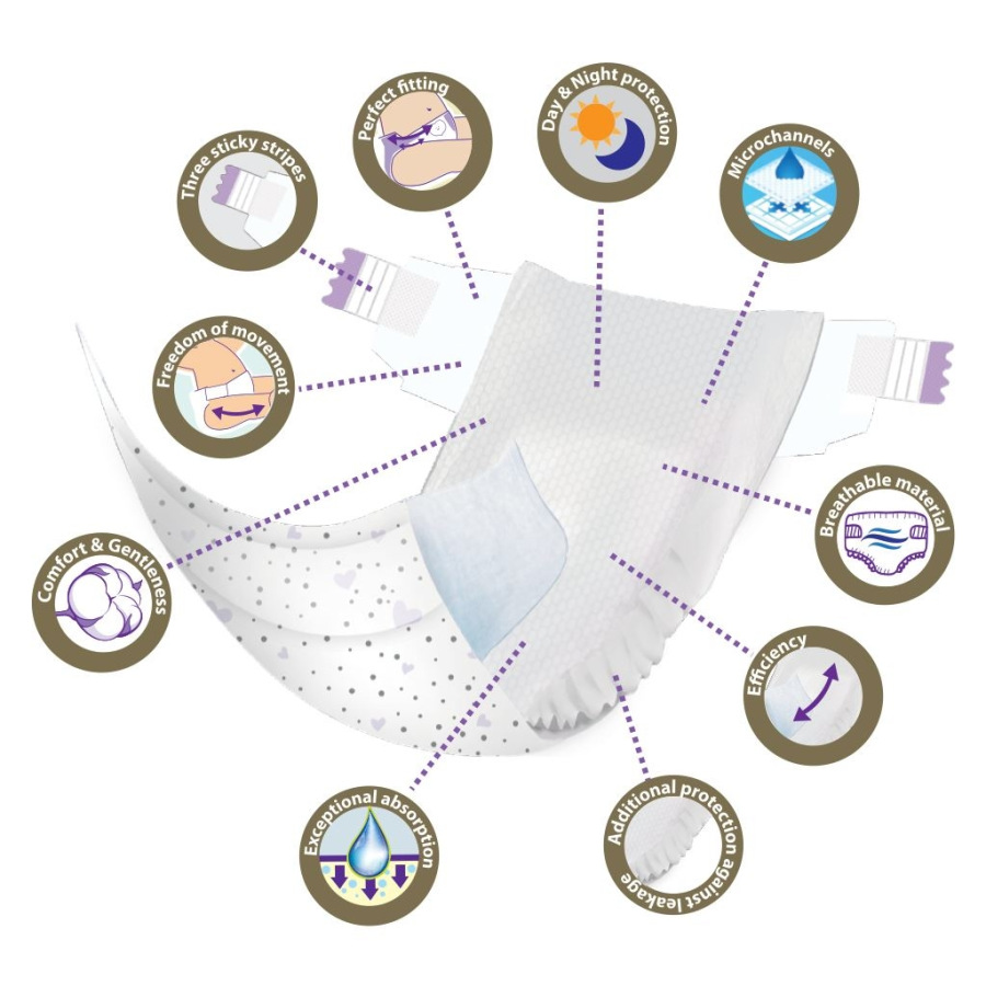 Hodvábne hebké detské jednorazové plienky New Love Premium comfort boli špeciálne navrhnuté preto, aby pokožka vášho dieťaťa cítila lásku a starostlivosť už od prvého dotyku. Špeciálne navrhnutý systém mikrokanálikov zaistí rovnomerné vsakovanie tekutiny, udržuje superabsorpčné jadro na svojom mieste a zabraňuje hrudkovaniu absorbéra. Inovatívne jadro je tvorené mikroperličkami, okamžite odvádza vlhkosť ďaleko od pokožky dieťaťa a pomáha udržať zadoček dieťaťa stále v suchu až po dobu 12 hodín. Aby mohla pokožka voľne dýchať, sú plienky vyrobené z priedušných materiálov zaisťujúcich cirkuláciu vzduchu.