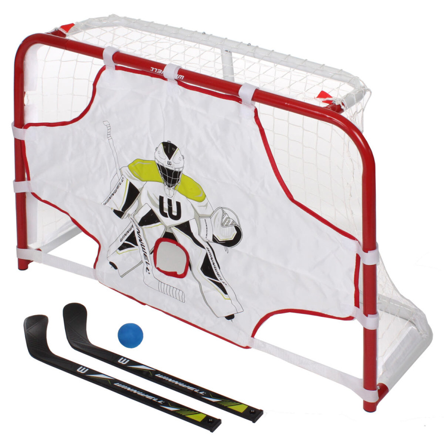 Detská skladacia bránka so streleckou plachtou Mini Quicknet Set je skvelý prostriedok na získanie prvých skúseností s hokejkou malých hokejistov. Doma, vonku pred garážou alebo v zime na ľade sa Vaši najmenší zabaví strieľaním na bránku sa streleckou plachtou. Základom setu je skladací bránka s rozmermi 79 x 53 x 30 cm z kovových rúrok s priemerom 2,24 cm s plastovými podložkami. Jednotlivé kusy konštrukcie ľahko zacvaknite k sebe vďaka systému "snap clip". Sieť k bránke upevníte pomocou povrázku, ktorý jednoducho prevlieknete pozdĺž celej bočnej konštrukcie. Na túto poctivú konštrukciu pripevníte potom pomocou suchých zipsov streleckú plachtu s obrázkom brankára a otvory pre triafanie sa do bránky. Súčasťou setu je tiež hutný a zároveň mäkký loptička zo EVA peny a dve malé plastové hokejky s dĺžkou 39 cm k päte a s lopatou s dĺžkou 14 cm. Jedna hokejka má pravý ohyb, druhá potom ohyb ľavostranný.Mini Quicknet Set:- ľahká konštrukcia "snap clip", netreba náradie- kovové rúrky s priemerom 2,24 cm- odolná polyesterová sieť- plastové podložky na ochranu podlahy- súčasťou balenia tréningový brankár (strelecká plachta) a dve plastové hokejky s loptičkou- dĺžka shaftu hokejky: 39 cm; dĺžka čepele: 14 cm
