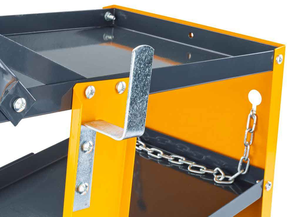 Robustná oceľová konštrukcia zaisťuje odolnosť a stabilitu, čo je nevyhnutné v náročných dielenských podmienkach. Vozík je odolný voči mechanickému poškodeniu a vplyvom prostredia.