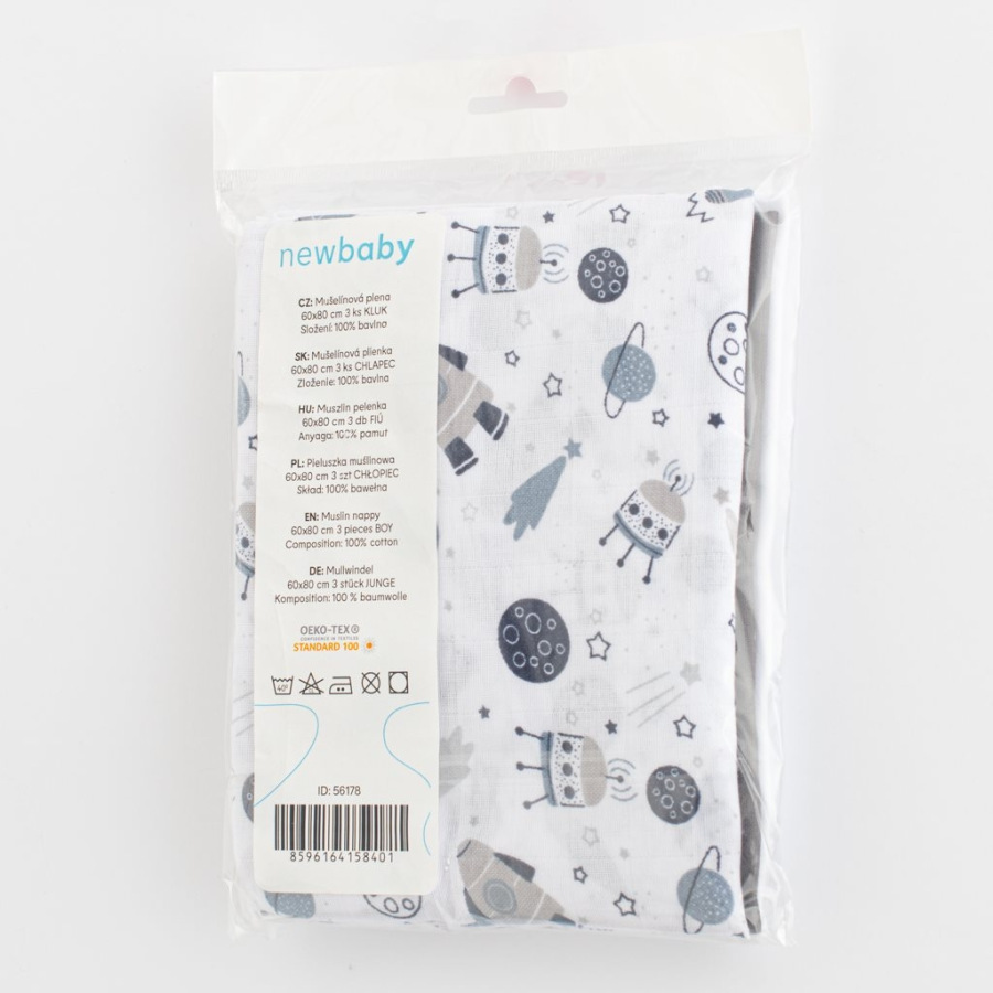 Mušelínové detské plienky New Baby v zvýhodnenej sade. Plienky vysokej akosti s výhodnou gramážou. Dobre absorbujú vlhkosť, umožňujú pokožke bábätka dýchať a nedráždia ju. Balenie obsahuje 3 ks. Dve plienky jednofarebné a jedna s obrázkom. Vhodne zvolené farby i obrázky pre chlapčekov. Ľahká štruktúra umožňuje mušelínu dýchať a zaisťuje dostatočnú cirkuláciu vzduchu, čím znižuje riziko prehriatia. Táto vlastnosť pomáha udržať Vaše dieťa v pohodlí, bezpečí a rodičov v pokoji. Mušelín je veľmi odolný a to tak, že bez problémov zvláda opakované pranie a postupom času je ľahší a jemnejší. Mušelínová plienka je ako stvorená na leto, kde môže nahradiť prikrývku v postieľke či kočíku. Multifunkčný produkt, ktorý sa oplatí mať vo výbave. Rozmer: 60x80 cm. Zloženie: 100% bavlna. Gramáž materiálu: 110g/m2. Certifikát: OEKO-TEX STANDARD 100.