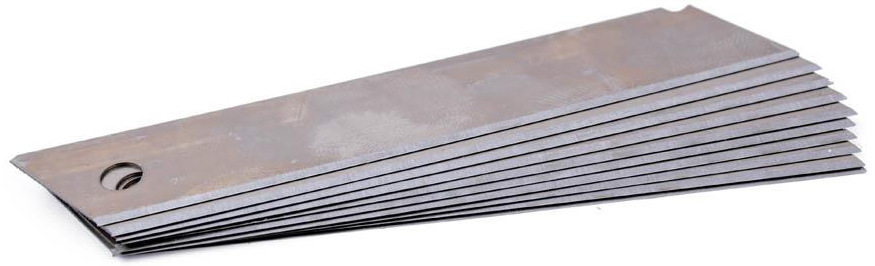 Náhradné čepele, ideálne pre nože na tapety. Táto sada obsahuje 10 ks čepelí. Čepele sú vyrobené z vysoko uhlíkovej pružinovej ocele pre výnimočnú odolnosť. Čepele sú zabalené v praktickom plastovom boxe, ktorý uľahčuje ich skladovanie. Navyše, vďaka použitej technológii kalenia majú čepele dlhšiu životnosť.