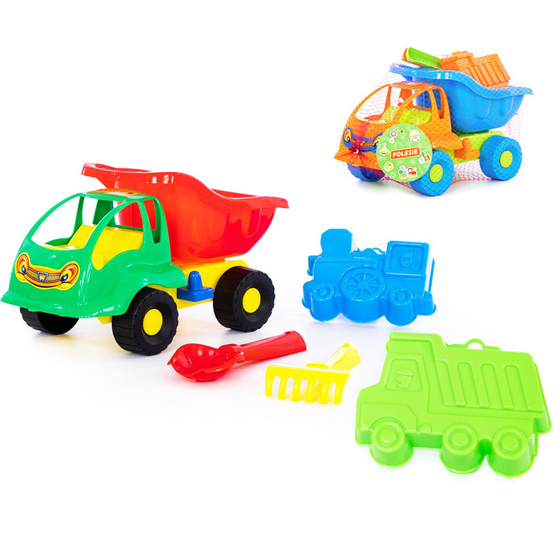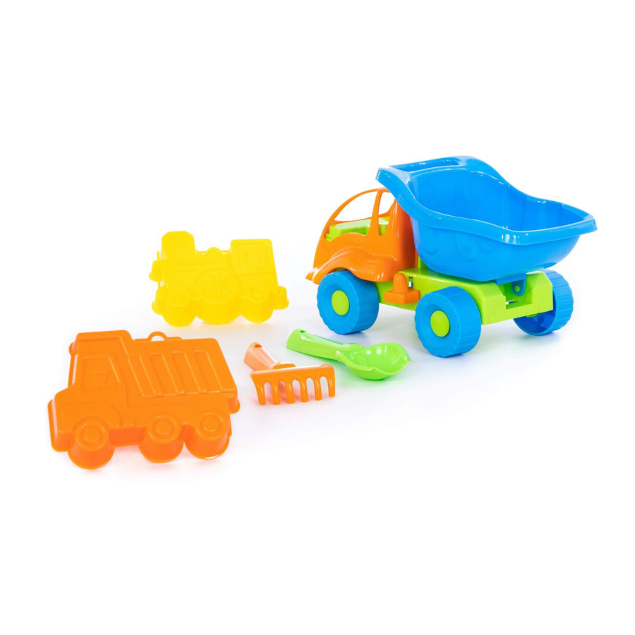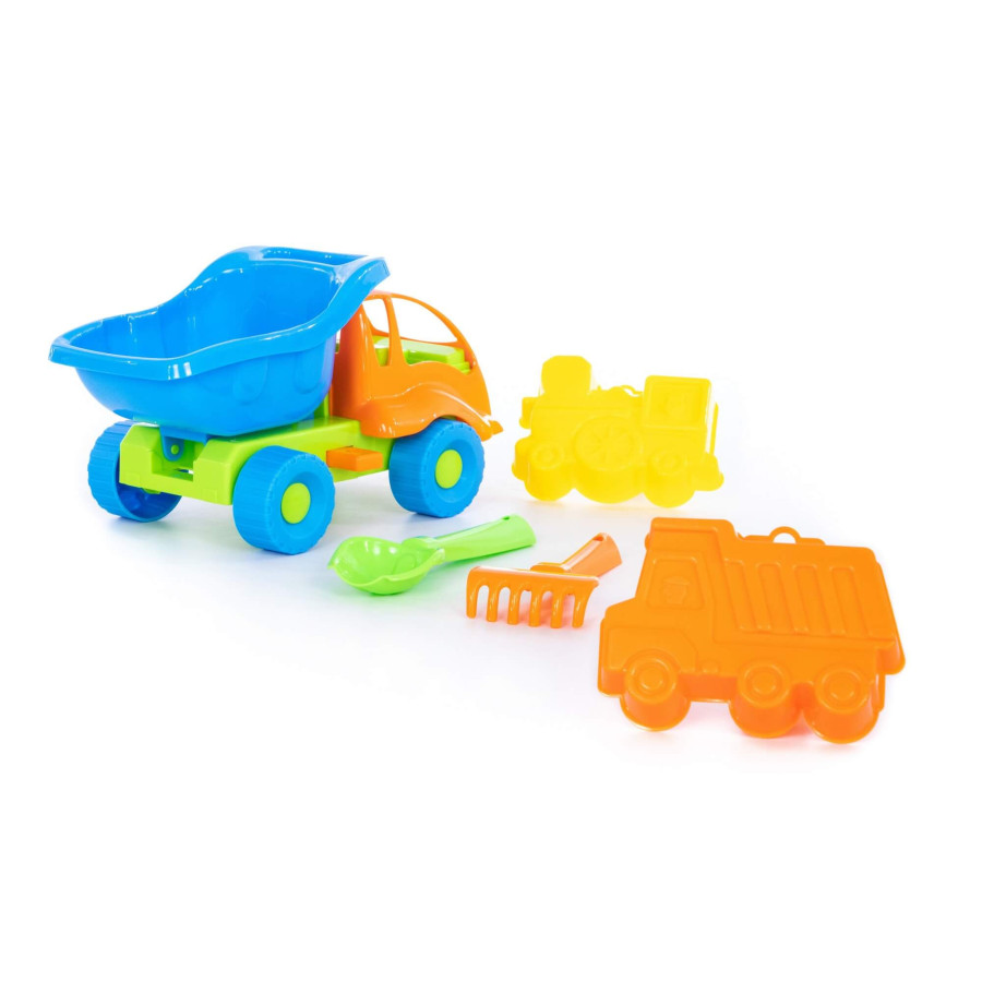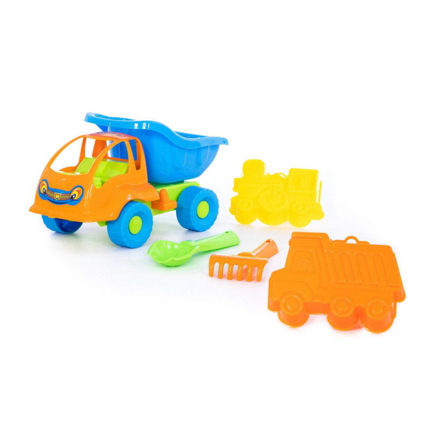 Nákladné autíčko na piesok s príslušenstvom, má rozmery 295х160х175 mm. Na výber je z dvoch farebných variánt. Sada obsahuje autíčko, 2 formičky, lopatku a hrable. Cena je za jednu sadu. Vhodné pre deti vo veku 3+ rokov.