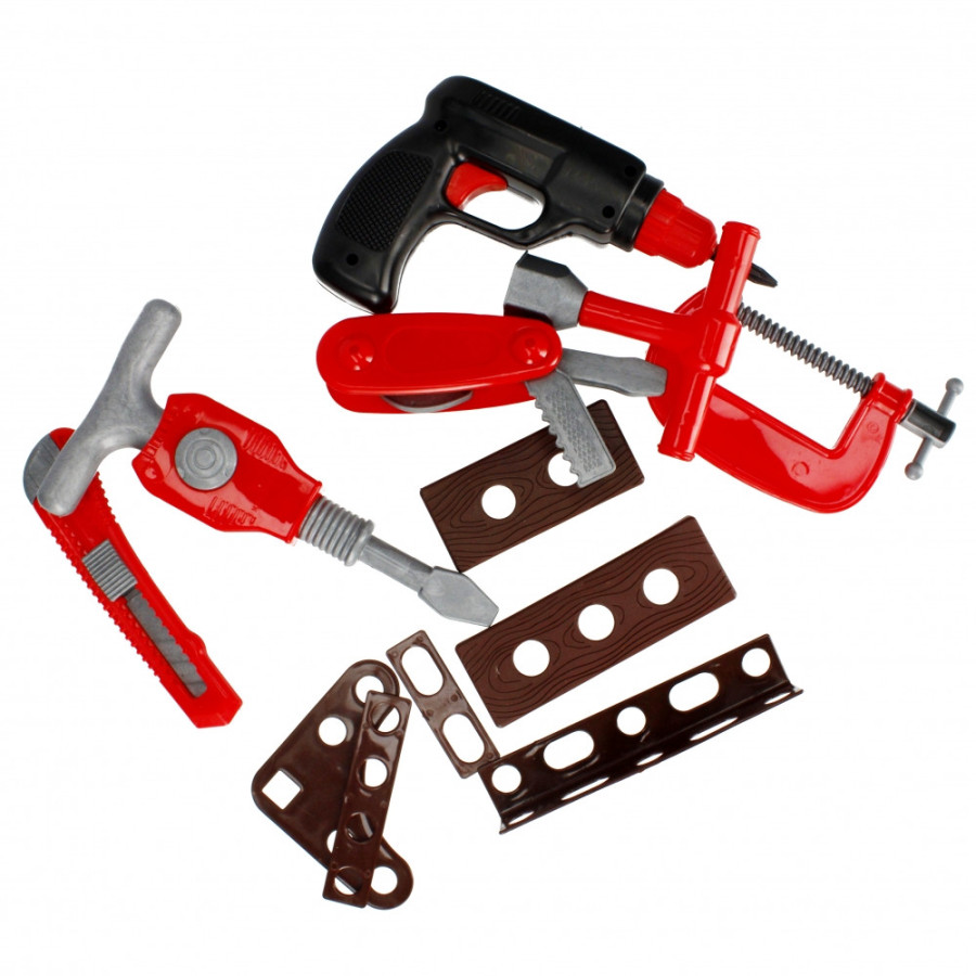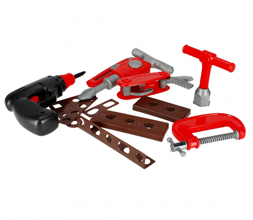 Náradie červené sada, obsah sady je vŕtačka, nôž na tapety, zverák, vŕtací skrutkovací nástavec, 2x doska, 4x štvorec, viacúčelový kľúč, pneumatické kladivo. Cena je za 1 sadu. Má rozmer 10X27 cm. Vhodné pre deti vo veku 3+.