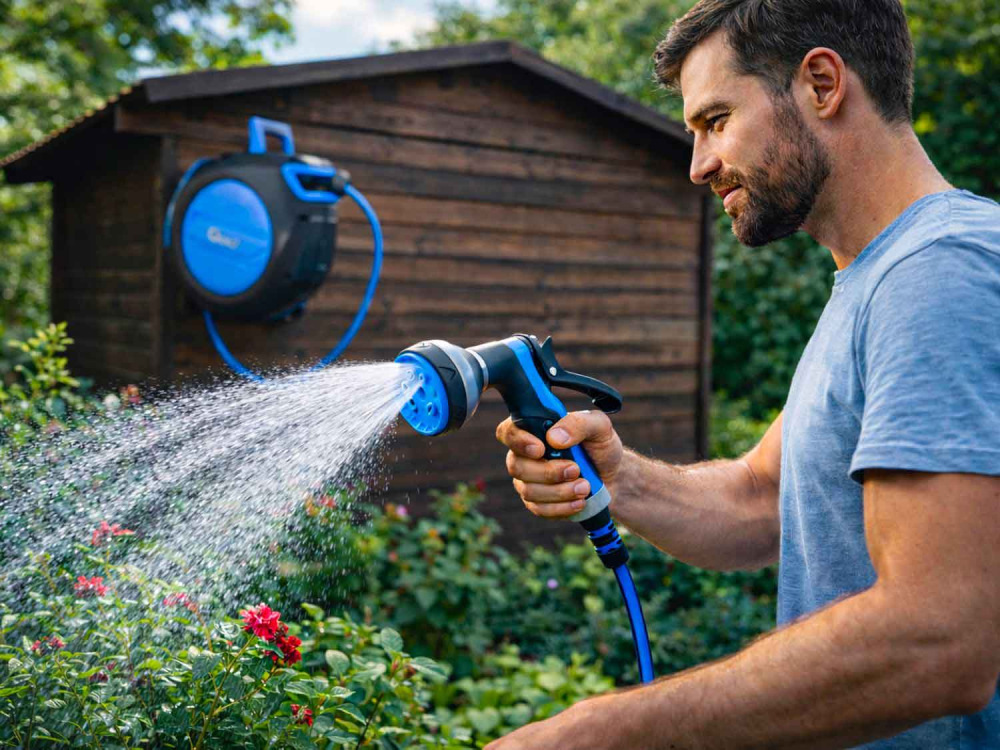 Kompaktné puzdro s rozmermi 35,5 x 36 x 20 cm chráni hadicu pred zalomením a UV žiarením, zatiaľ čo dodávaná 7-cestná kovová rozprašovacia pištoľ umožňuje nastaviť prúd vody na zavlažovanie, umývanie alebo oplachovanie. Toto je riešenie pre tých, ktorí sa nechcú po každom zavlažovaní trápiť so zamotanou hadicou o stenu.