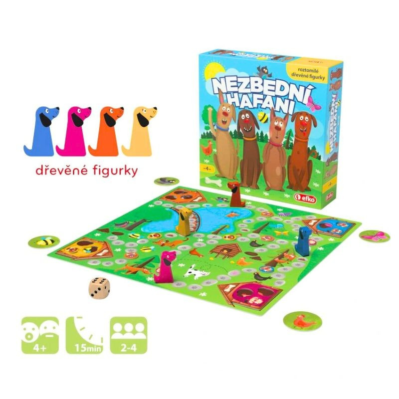 Jednoduchá a zábavná stolová hra pre deti s roztomilými drevenými figúrkami psíkov. Psie maminky sa snažia dostať svoje šteniatka späť do búdky, kým príde čas obeda. Hra rozvíja jemnú motoriku, trpezlivosť a sústredenie. Obsahuje herný plán, 4 drevené figúrky, 12 žetónov, 4 búdky a hraciu kocku. Vhodné pre deti od 4 rokov.