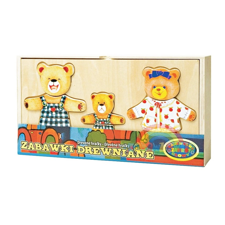 Obleč macíka. V praktickej drevenej krabičke sú rôzne drevené oblečenia na vkladanie.