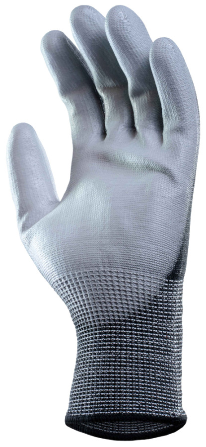 Rukavice na ochranu pred mechanickými rizikami, vyrobené z pleteného nylonu a spandexu s prídavkom sklenených vlákien (priadza HPPE, hrúbka 13 U2), potiahnuté sivým polyuretánom. Priadza HPPE vytvára mimoriadne odolné a odolné rukavice, vďaka čomu sú vhodné do najnáročnejších pracovných prostredí.