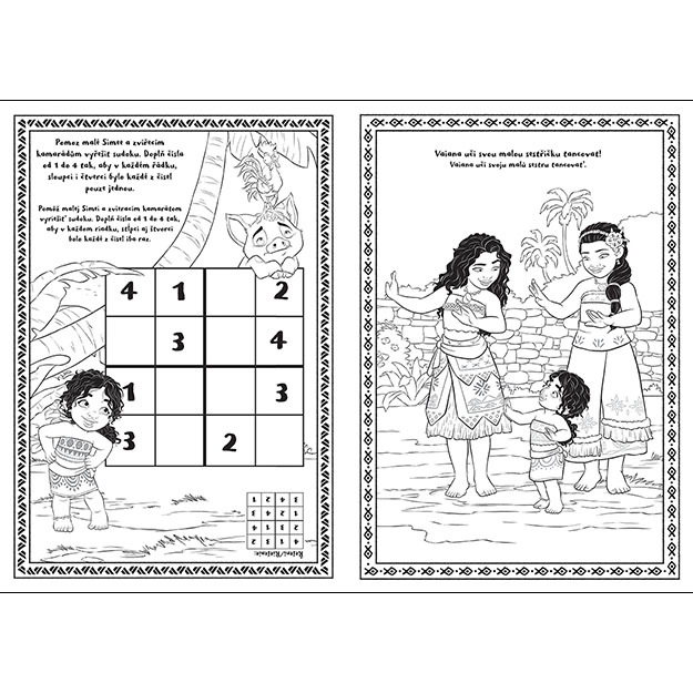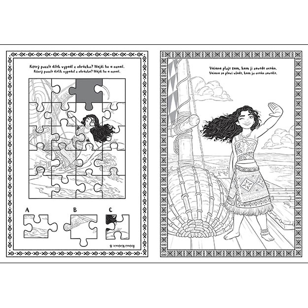 Omaľovánka A4 Vaiana 2. Omaľovánka obsahuje 16 čiernobielych strán s obrázkami na vyfarbenie a obľúbenými aktivitami.