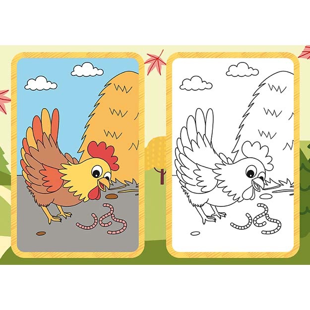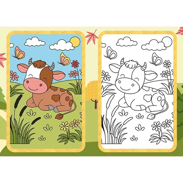 Omaľovánka A5 Farma. Omaľovánka obsahuje 9 čiernobielych obrázkov na vyfarbenie a 9 farebných predlôh.