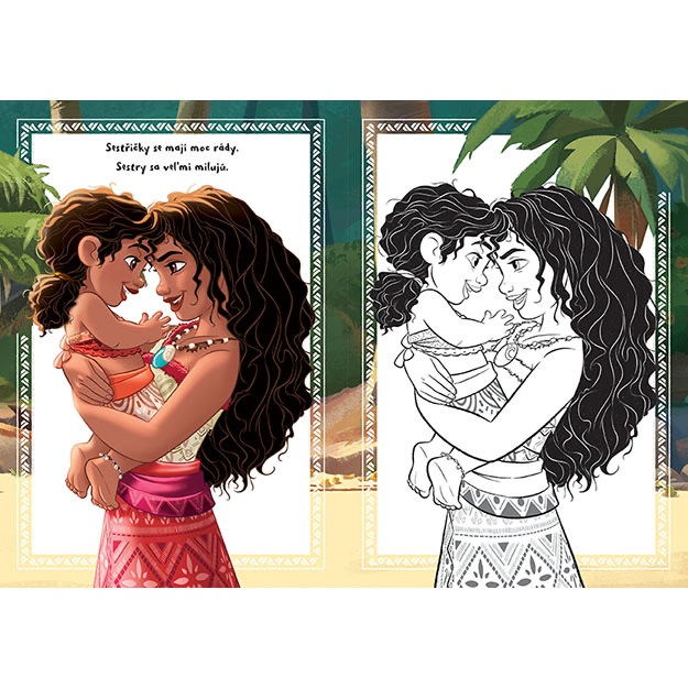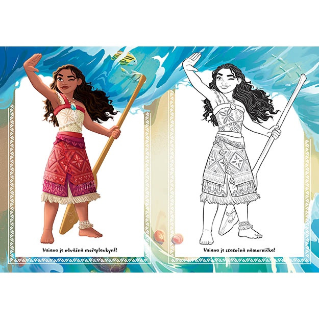 Omaľovánka A5 Vaiana 2. Maľovanky obsahujú 9 čiernobielych obrázkov na vyfarbenie a 9 farebných predlôh.