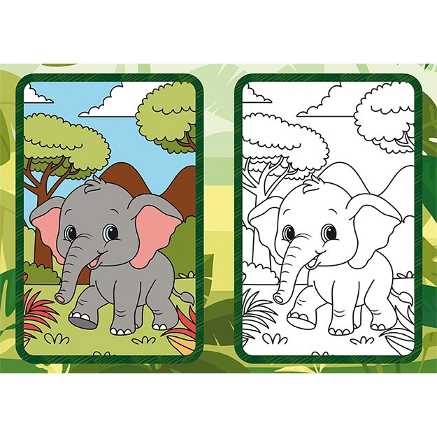 Omaľovánka A5 Zoo. Omaľovánka obsahuje 9 čiernobielych obrázkov na vyfarbenie a 9 farebných predlôh.