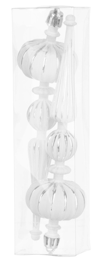 Súprava ozdôb slúži na slávnostné ozdobenie vianočného stromčeka. Pozostáva z 2 ks ozdôb s rozmermi 16x4,5 cm. Farba ozdôb je strieborná. Sú vyrobené z plastu.