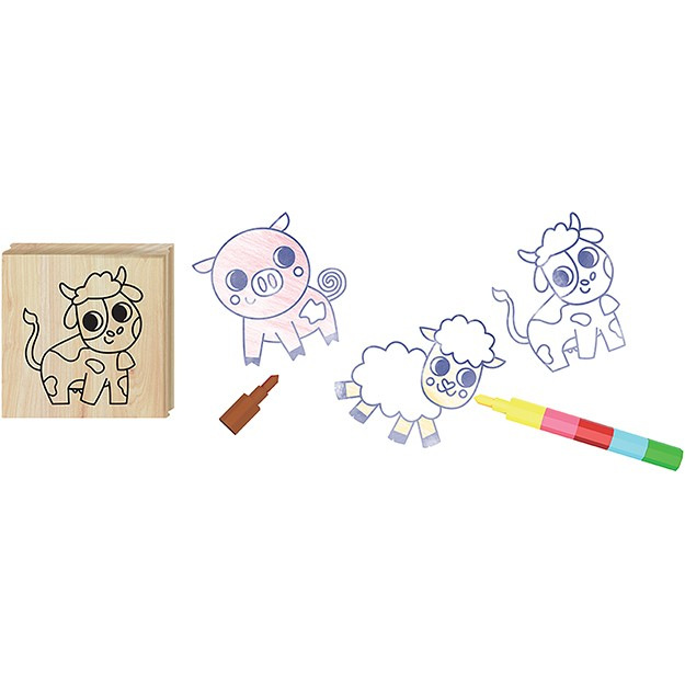 Kreatívny set Pečiatky 3 + 1 Farma prinesie deťom zábavu plnú farmárskych motívov a tvorenia. Sada obsahuje tri ľahko uchopiteľné drevené pečiatky, farebnú podušku s obľúbeným motívom a praktickú šesťfarebnú skladaciu voskovku na vyfarbovanie obrázkov. Hra s pečiatkami podporuje rozvoj jemnej motoriky, kreativity a fantázie pri vytváraní vlastných obrázkov a scén z farmy.