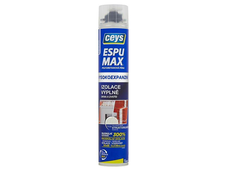 Polyuretánová pena Espumax pre izoláciu a výplne s vysokou expanziou (300%). Určená špeciálne pre tesnenie, výplne, akustickú a tepelnú izoláciu. Po nanesení zväčší objemovú hmotnosť až na 40 litrov a vytvorí trojrozmernú štruktúru z dutých buniek, ktoré predstavujú bariéru proti hluku, teplu a vlhkosti. Je kompaktná a hutná. Tesní a vypĺňa dutiny a špáry. Izoluje vzduchové komory, vodovodné potrubie a elektrické káble, klimatizačné zariadenia. Vypĺňa a upcháva steny, múry, podhľady, prechody trubiek, priestory pod vaňami, strechami, a pod.