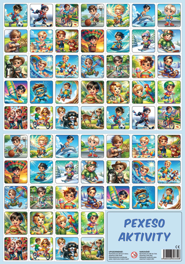 Spoločenská hra pexeso Aktivity, pri ktorej si deti hravou formou trénujú svoju pamäť. Hra sa po rozstrihaní skladá z 32 obrázkových dvojíc. Pexeso 32 dvojíc s obrázkami detských aktivít.