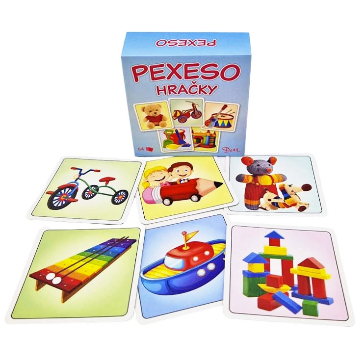 Pexeso Hračky je určená predovšetkým deťom, ale aj starším hráčom s veľmi dobrou pamäťou a postrehom. Pexeso je prakticky nastrihané v cestovnej krabičke. Karty pexesa sú nádherne ilustrované a majú rozmer karty až 6,5cm. Balenie obsahuje 64kariet.