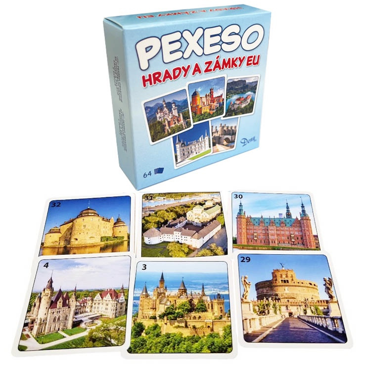 Pexeso Hrady a Zámky Európy je určená predovšetkým deťom, ale aj starším hráčom s veľmi dobrou pamäťou a postrehom. Pexeso je prakticky nastrihané v cestovnej krabičke. Karty pexesa sú nádherne ilustrované a majú rozmer karty až 6,5cm. Balenie obsahuje 64kariet, 32 dvojíc.