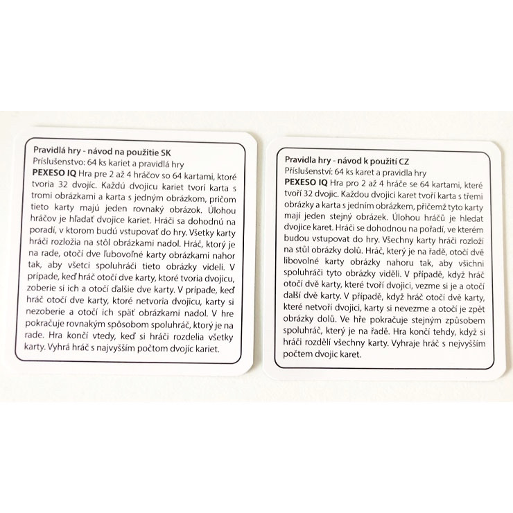 Pexeso IQ je náročnejšia forma klasického pexesa. Je určená predovšetkým deťom, ale aj starším hráčom s veľmi dobrou pamäťou a postrehom. Pexeso je prakticky nastrihané v cestovnej krabičke. Karty pexesa sú nádherne ilustrované a majú rozmer karty až 6,5cm. Balenie obsahuje 64kariet.