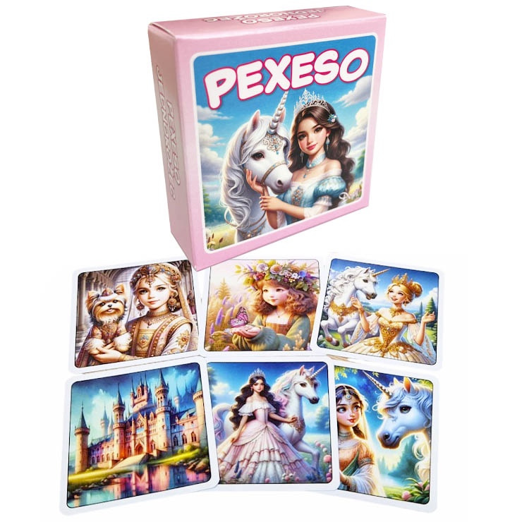 Pexeso Jednorožce je určená predovšetkým deťom, ale aj starším hráčom s veľmi dobrou pamäťou a postrehom. Pexeso je prakticky nastrihané v cestovnej krabičke. Karty pexesa sú nádherne ilustrované a majú rozmer karty až 6,5cm. Balenie obsahuje 64kariet, 32 dvojíc.