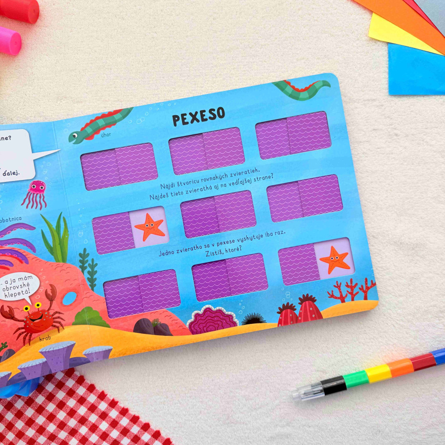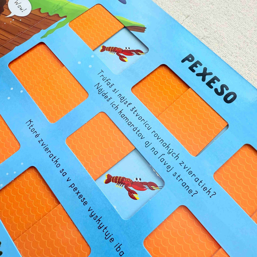Odkry 2 okienka a nájdi 2 rovnaké zvieratká. Ktoré zvieratko nemá pár? Pexeso knižka obsahuje zábavné úlohy s krásnymi ilustráciami, ktoré podporujú detskú zvedavosť aj kreativitu a rozvíjajú postrehové a pamäťové zručnosti. Deti spoznajú záhadný svet pod hladinou a jeho obyvateľov. Ako už názov napovedá, na každej dvojstrane sa nachádza okienkové pexeso!