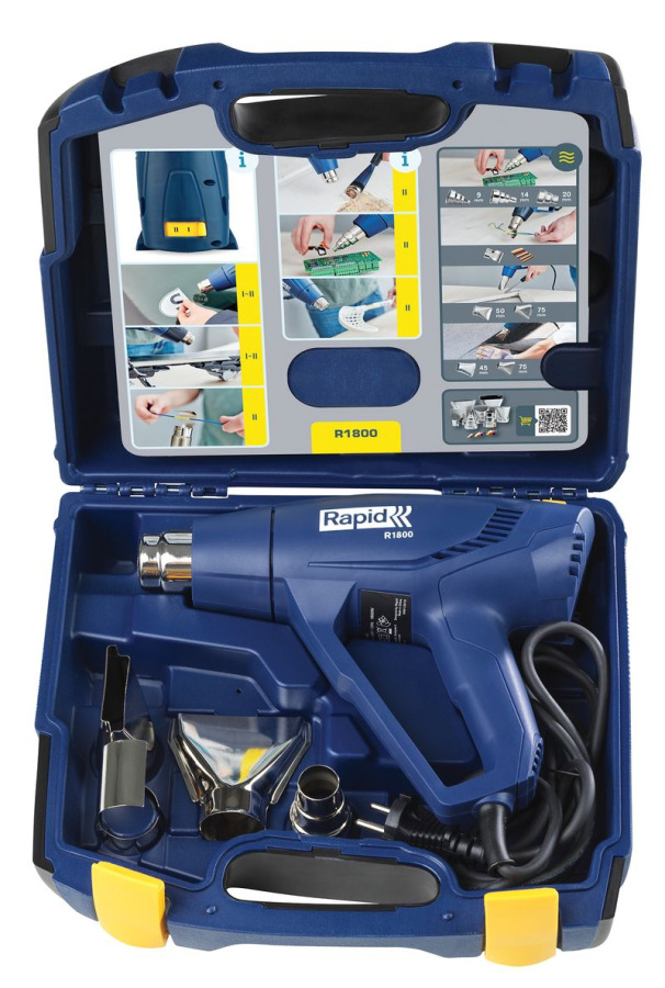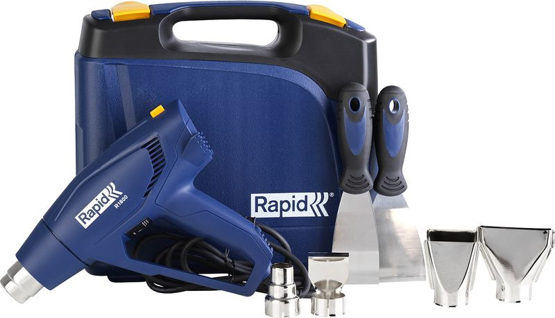 Pištoľ RAPID R1800 je jednoduchá, šikovná teplovzdušná pištoľ, špeciálne vytvorená na zvládanie prác, ako je odmrazovanie, voskovanie lyží a snowboardov, plienok dláždených ciest a nespočetné množstvo ďalších každodenných úloh v dome, na dvore alebo v garáži. S výkonom 1800 W, dvojstupňovou reguláciou teploty (300 °C a 550 °C) a nastaviteľným prúdom vzduchu vykoná R1800 prácu rýchlo a presne. Vyznačuje sa tiež krytom rukoväte, zvyšujúcim bezpečnosť a pokoj užívateľa. Dodáva sa v kufríku s 2 škrabkami a 4 nádstavcami.