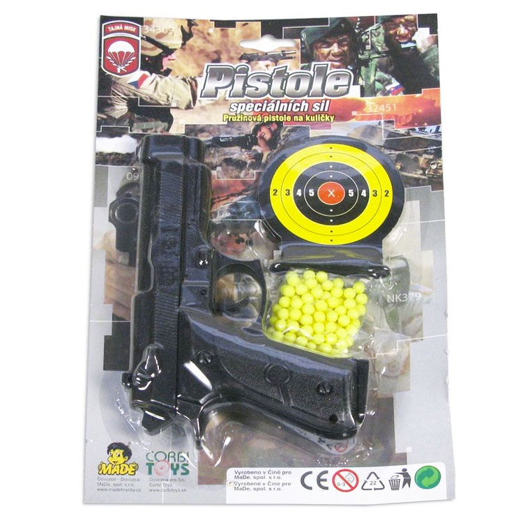 Pištoľ špeciálnych síl,18cm veľká, na guľôčky, v balení je terč a sáčik guľôčok.
