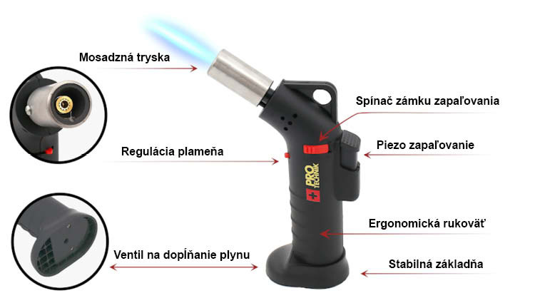Plynový horák s doplňovaním plynu a integrovaným piezo zapaľovaním, PRO-TECHNIK