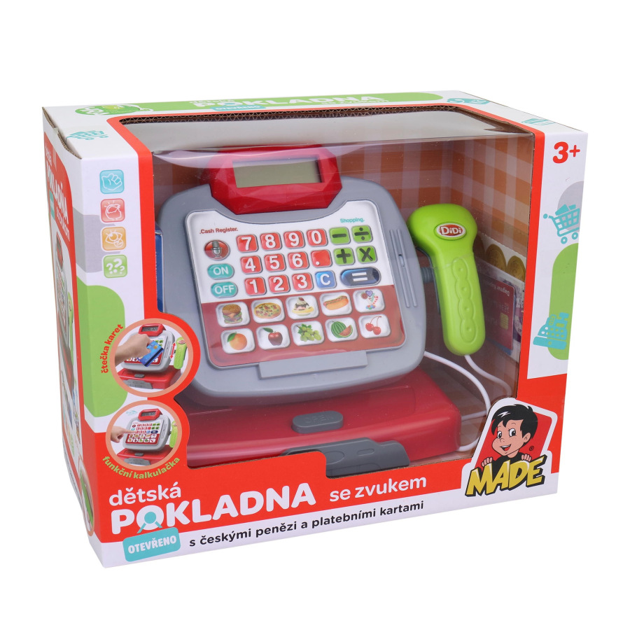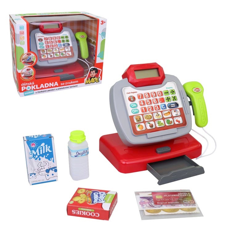 Pokladňa na batérie, český design, 20 cm. Úplne nová česká pokladňa! Skvelý doplnok pri hre na obchod, každé z detí sa bude chcieť stať pokladníčkou len aby mohli obsluhovať túto jedinečnú pokladňu.