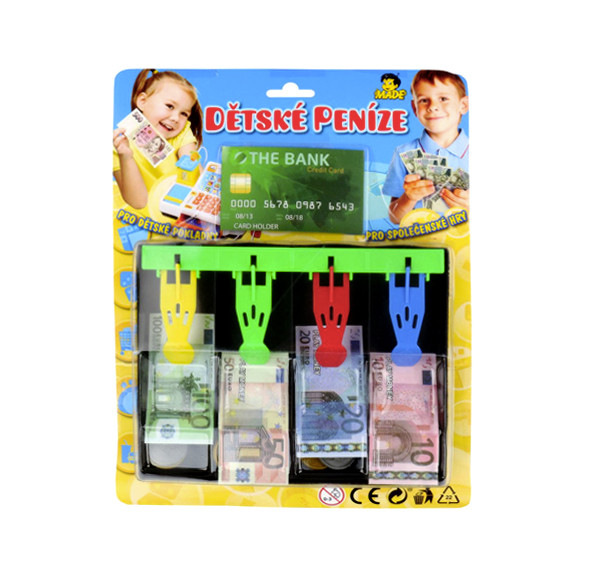 Pokladňa s Eurami, pokladničná zásuvka s rozmermi 19 x 16 cm a bankovkami nom. 10,20,50 a 100 a s mincami z plastu.