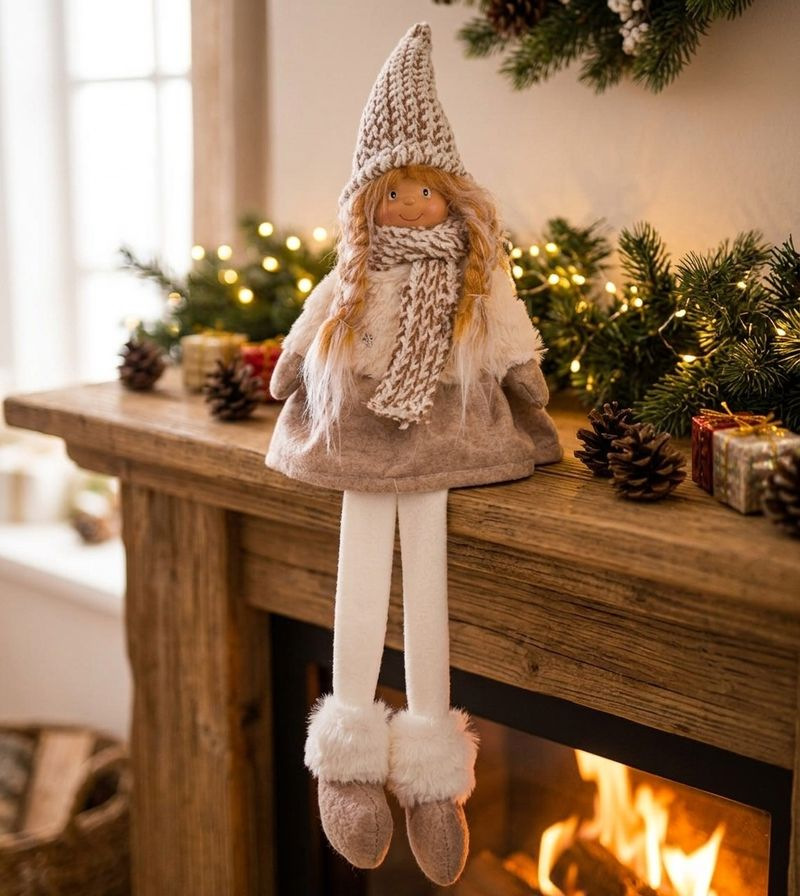 Postavička MagicHome Vianoce, Dievčatko s vysokým klobúkom, látkové, hnedo-biele, sediace, 17x12x54