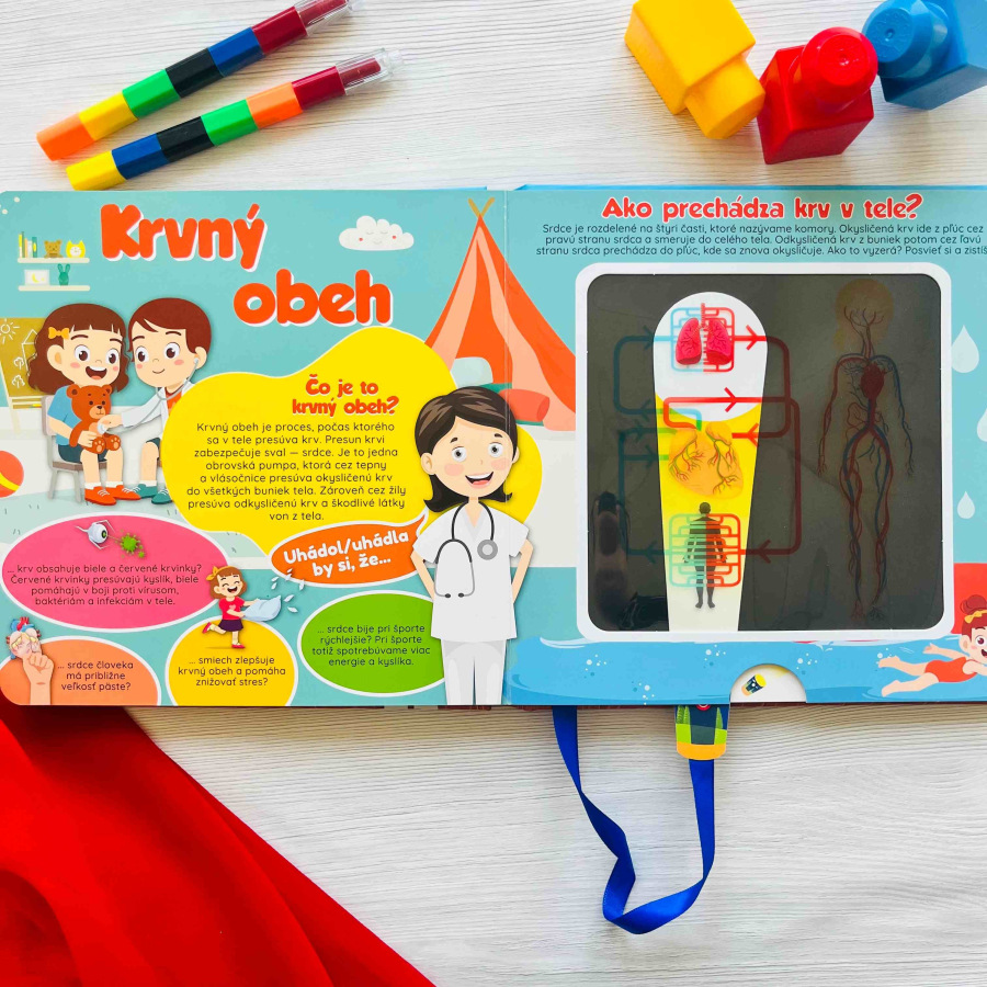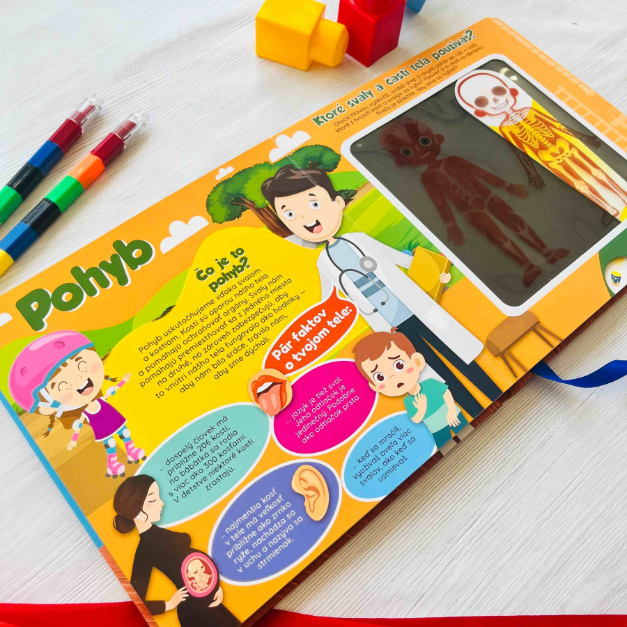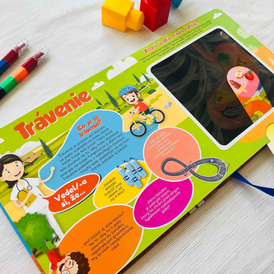 Ako prebieha trávenie? Prečo kýchame? Dokážeme jesť aj dole hlavou? Odpovede na tieto aj mnohé ďalšie otázky prináša interaktívna kniha s baterkou Posvieť si na ľudské telo. Deti sa hravou formou dozvedia, ako funguje dýchanie, trávenie, pohyb, krvný obeh, zmyslové vnímanie či nervová sústava. Vďaka špeciálne upraveným tmavým stránkam a pribalenej papierovej baterke môžu objavovať skryté obrázky a tajomstvá nášho tela. Spestrením sú aj kreatívne úlohy, ktoré podporujú pozornosť, logické myslenie a fantáziu.