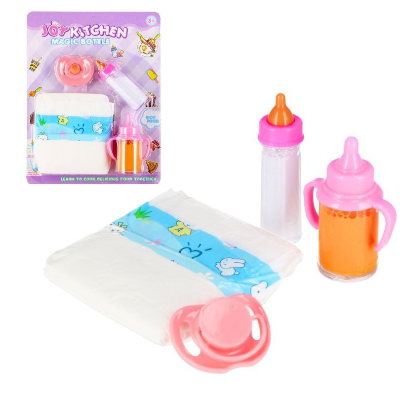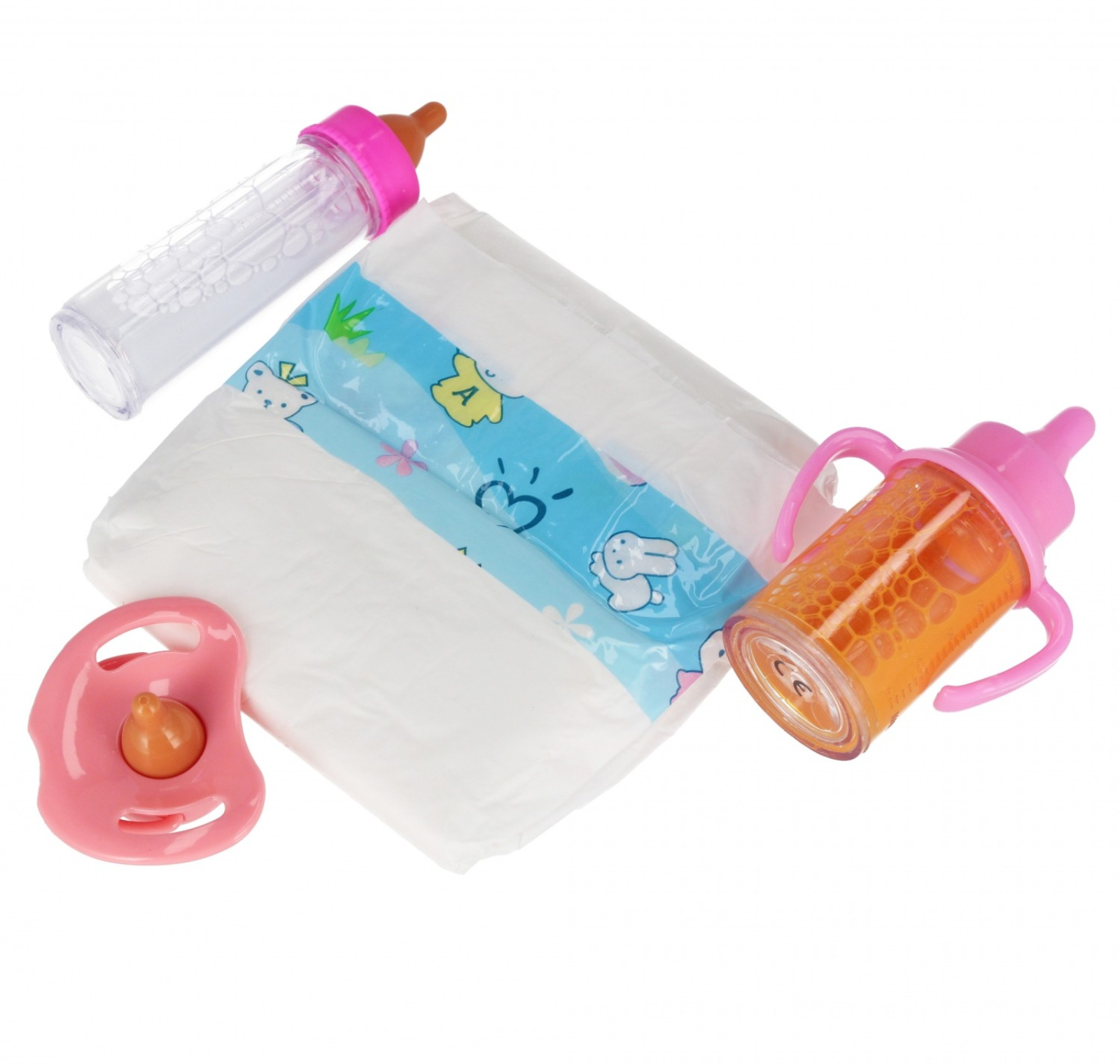 Detská sada doplnkov pre bábiku bábätko – fľaštičky, plienka a cumlík umožnia deťom starať sa o svoju bábiku ako o skutočné dieťatko. Rozvíja empatiu, starostlivosť a predstavivosť. Určené pre deti od 3 rokov. Cena za kus.