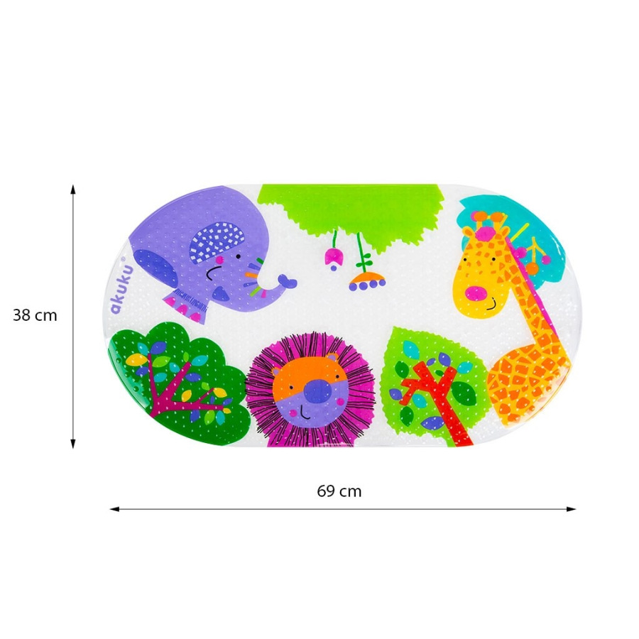 Protišmyková podložka značky „akuku“ je určená na použitie v detskej vaničke, vani aj sprchovom kúte. Zabezpečuje bezpečnosť pri kúpaní. Farebná potlač spríjemní každodennú starostlivosť.