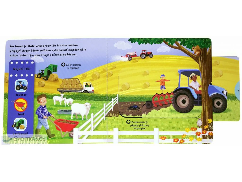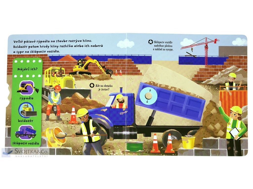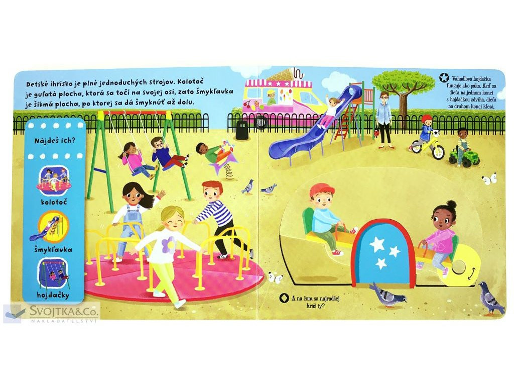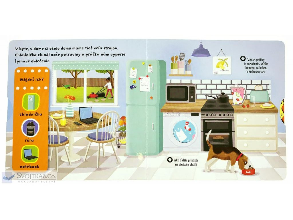 Prvé objavy - Stroje, má v každej scéne pohyblivé prvky. Knižka má 10 strán. Jej rozmery sú 18x18cm.