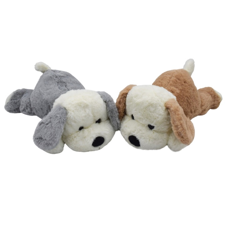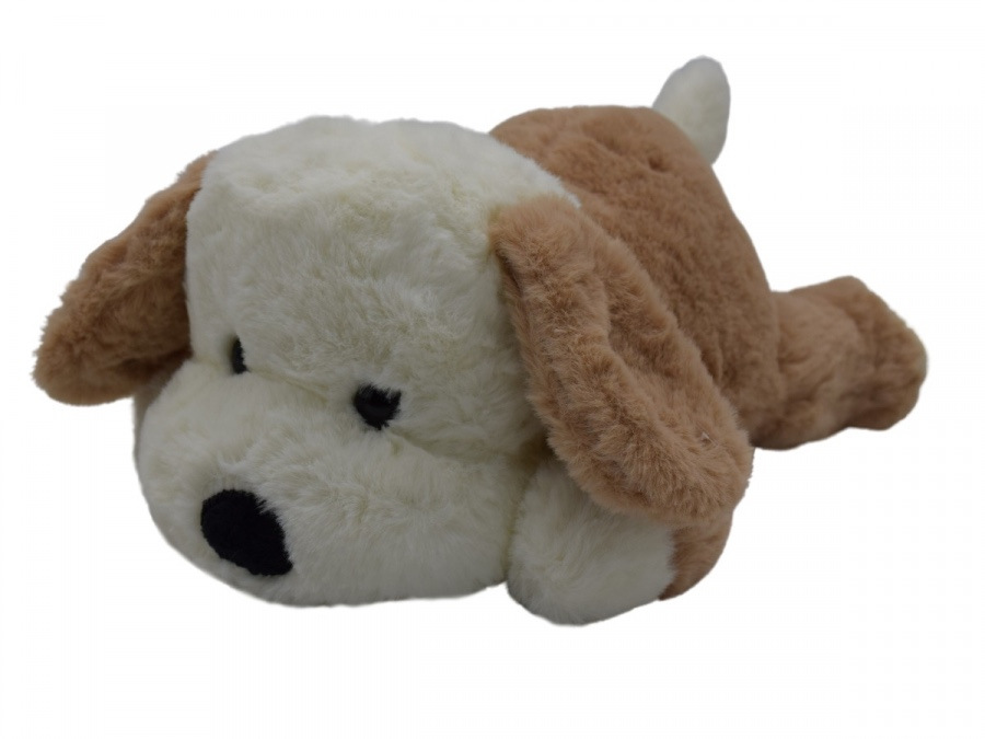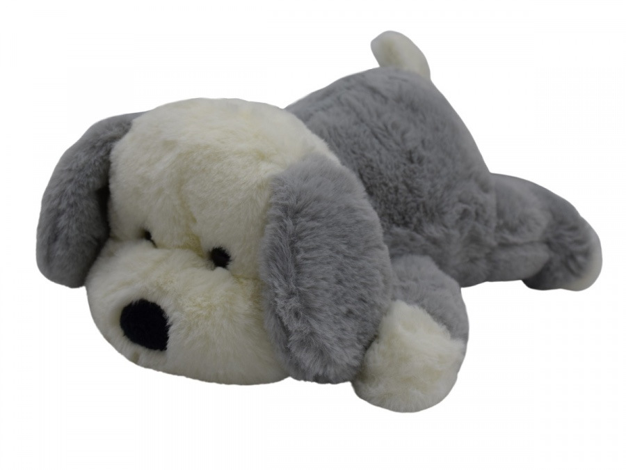 Jemný ležiaci 26cm psík Pinko. Možnosť výberu z dvoch farieb - sivý alebo hnedý.