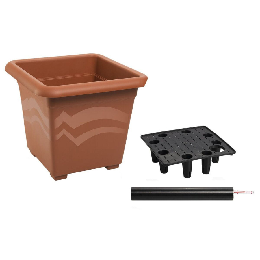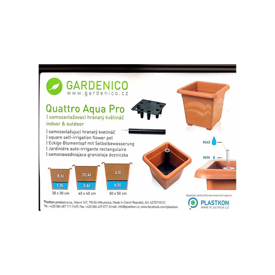 Hranatý samozavlažovací kvetináč Quattro Aqua Pro je vyrobený z odolného plastu, v matnom prevedení a po stranách s lesklým dekorom. Na dne kvetináča je vyberateľný rošt, ktorý v kvetináči vytvorí zásobník vody a rastlina tak môže čerpať vlahu postupne. V kvetináči môžete pestovať rastliny vonku aj doma, je vhodný pre veľké množstvo zeminy (zasadiť do neho môžete i urastenejšie rastliny). Súčasťou balenia je nalievací trubička s ukazovateľom výšky hladiny vody. Kvetináč stojí na štyroch nízkych nožičkách a v jeho dne je možné vyvŕtať drenážny otvor pre odtok prebytočnej dažďovej vody (ak ho používate na záhrade). Kvetináč ponúkame v niekoľkých veľkostiach a dvoch farebných prevedení - hnedá a terakota. Ku kvetináči si môžete dokúpiť misku pod kvetináč Quattro.Parametre:Quattro Aqua Pro 30Výška: 25 cmŠírka: 29 cmQuattro Aqua Pro 40Výška: 34 cmŠírka: 39 cmQuattro Aqua Pro 50Výška: 42 cmŠírka: 49 cm