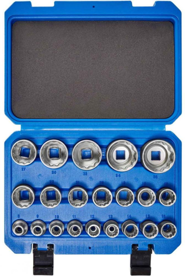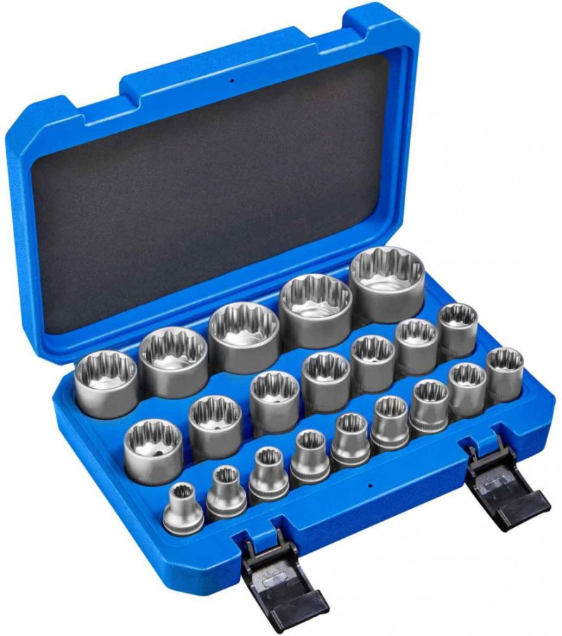 Sada špeciálnych 12-hranných hlavíc s profilom Gear Lock. Hlavice umožňujú odskrutkovať niekoľko typov skrutiek: šesťhran, dvanásťhran, skrutky s profilom Torx-E a palcové skrutky. Hlavice sú vyrobené z odolnej chróm-vanádiovej ocele.