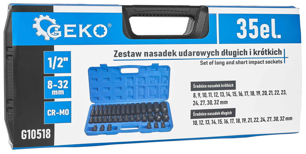 Sada 1/2" úderových hlavíc dlhých i krátkych 8-32 mm, 35-dielna sada v kazete, GEKO