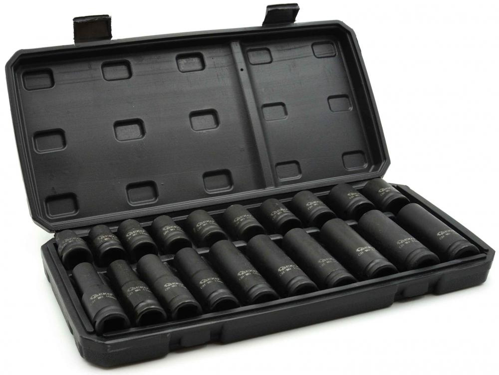Sada dlhých a krátkych 1/2" priemyslových hlavíc vo veľkostiach od 10 do 19 mm. Nástrčné hlavice sú vyrobené z vystuženej chróm-molybdénovej ocele. Pridanie molybdénu zabraňuje deformácii, čo zvyšuje všeobecnú odolnosť tohto typu ocele proti korózii vo vlhkom a kyslom prostredií.