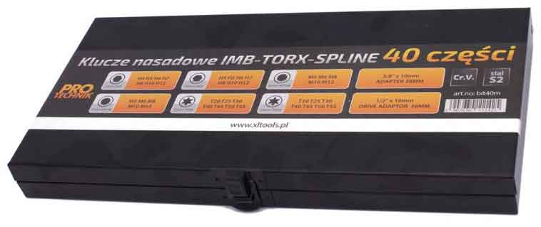 Sada nástrčných kľúčov IMB TORX SPLINE pozostáva zo 40 rôznych nástrčkových hrotov vyrobených z ocele S2. Oceľ S2 je oveľa tvrdšia ako oceľ Cr.V, vďaka čomu sú hroty pevné a odolné. Táto sada je univerzálna, pretože obsahuje bity pre tri typy skrutiek: HEX, SPLINE a TORX.